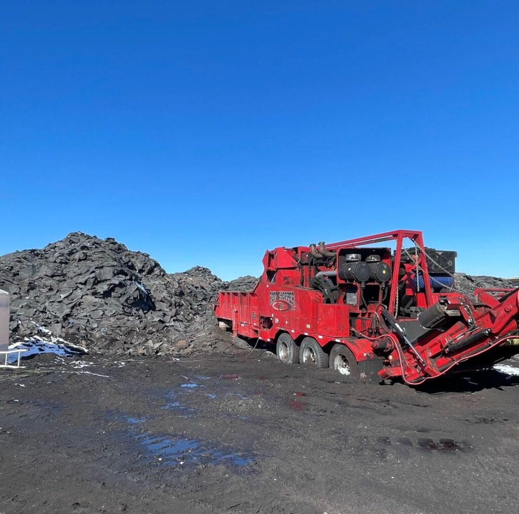Executive Director Jennifer Koole and Operations Manager Jim Gordon toured Razphalt‘s Calgary shingle recycling facility with Zack Irvine.
